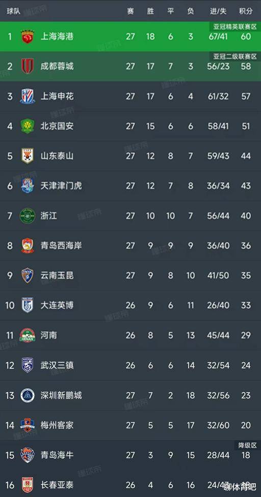 北京时间10月19日,中超第27轮已结束6场比赛,让我们来看看最新的积分变化!