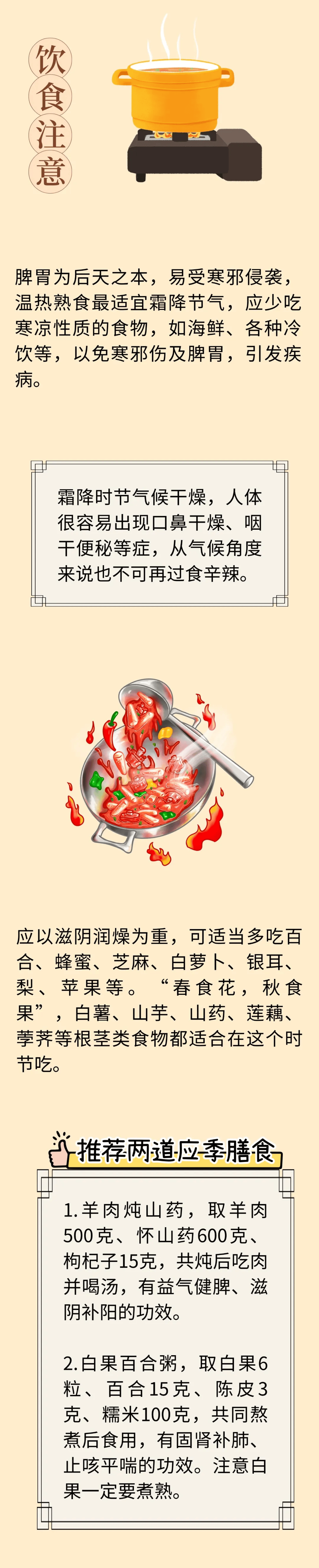 时间过得飞快,转眼间霜降节气就要来了。霜降是秋季最后一个节气,是由秋到冬的过渡阶段。寒、燥是霜降时节的气候特点。寒气渐生,各地气温持续下降,此时人体容易出现感冒、咳嗽、腹痛、腹泻、关节疼痛等不适,需做好防寒准备。另外秋季燥气当令,也需注意润燥。民间有谚语“一年补透透,不如补霜降”,可见霜降时节的养生保健尤为重要。