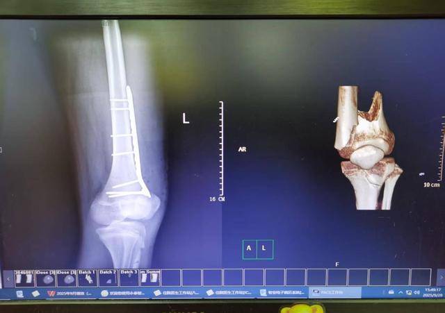 在董洁的带领下,由何芳清、何迎波等主治医师组成的手术团队,为患者实施“左股骨远端骨折开放复位钢板内固定术”。手术中,团队配合默契,展现出高超的专业技术,在有限的操作空间内精准复位每一处骨折块,并完成内固定安置,全程完好地保护了骨骺结构,实现骨折修复与生长功能保全双重目标。术后,经过医护团队的精心治疗和护理,患者恢复顺利,左膝关节功能得到良好保留,于10月初康复出院。