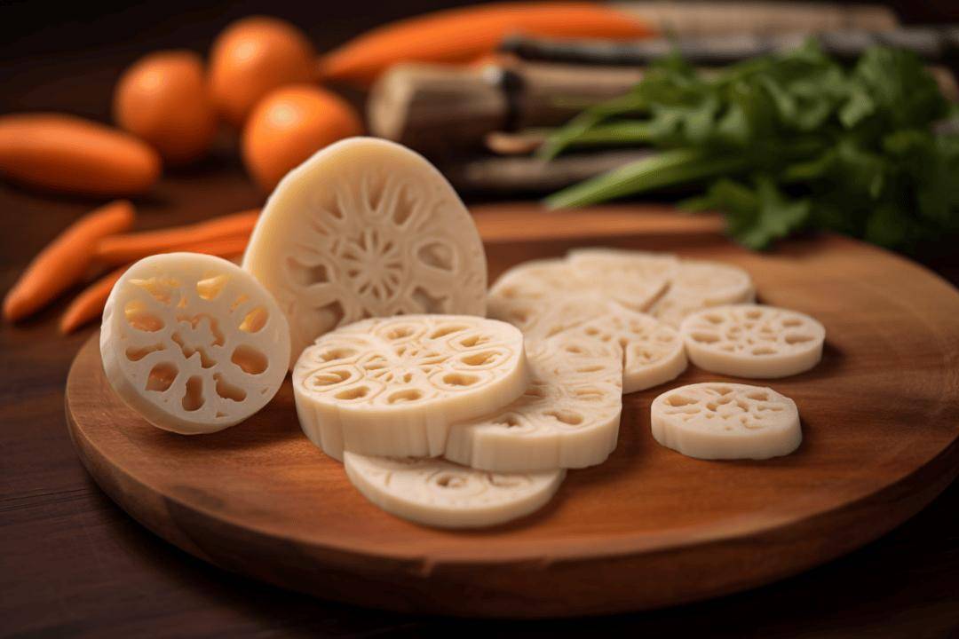 第二步,将莲藕洗净后去皮、切块。将葱、姜切片。