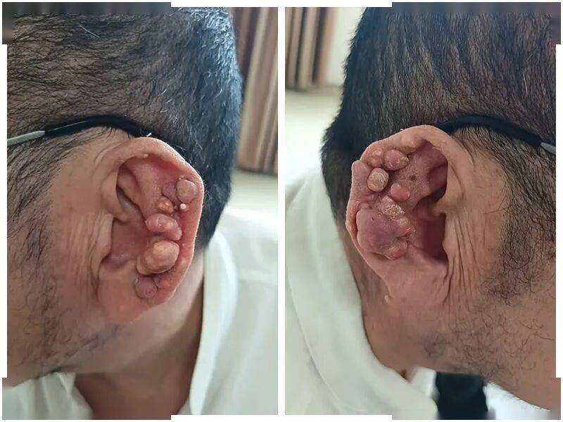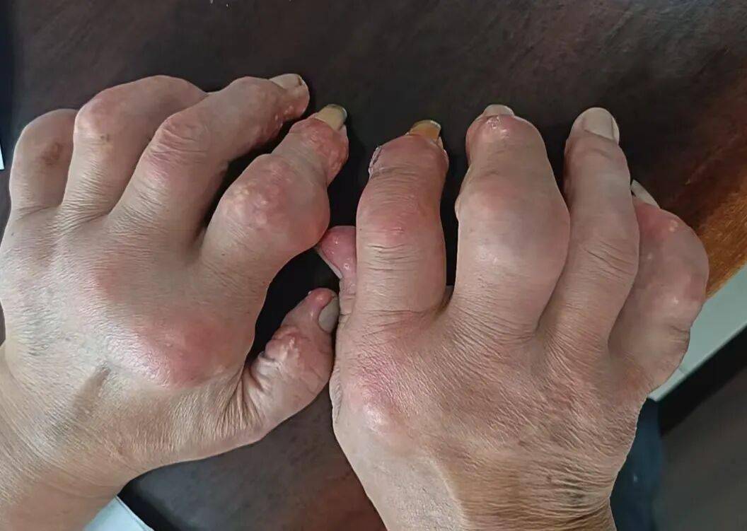 随着时间推移,刘大爷身上已是痕累累:双手、双脚、膝关节上鼓满了硬邦邦的痛风石,甚至连耳朵上都能摸到凸起的小疙瘩,活像长了串小石子。