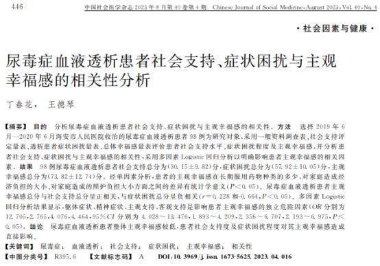 [1]尿毒症血液透析患者社会支持、症状困扰与主观幸福感的相关性分析 丁春花;王德琴 中国社会医学杂志 2023-08-15