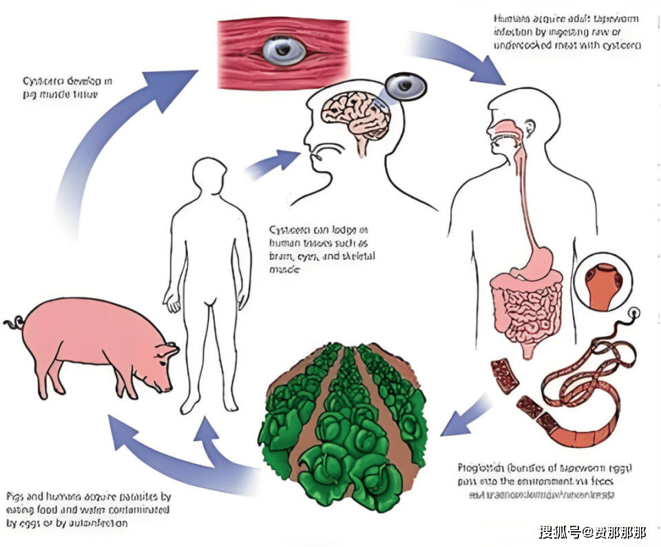 当人食入猪肉绦虫虫卵后,卵在肠道内孵化成幼虫,随后穿过肠壁进入肠系膜小静脉,再通过体循环到达脑膜、脑实质以及脑室内。