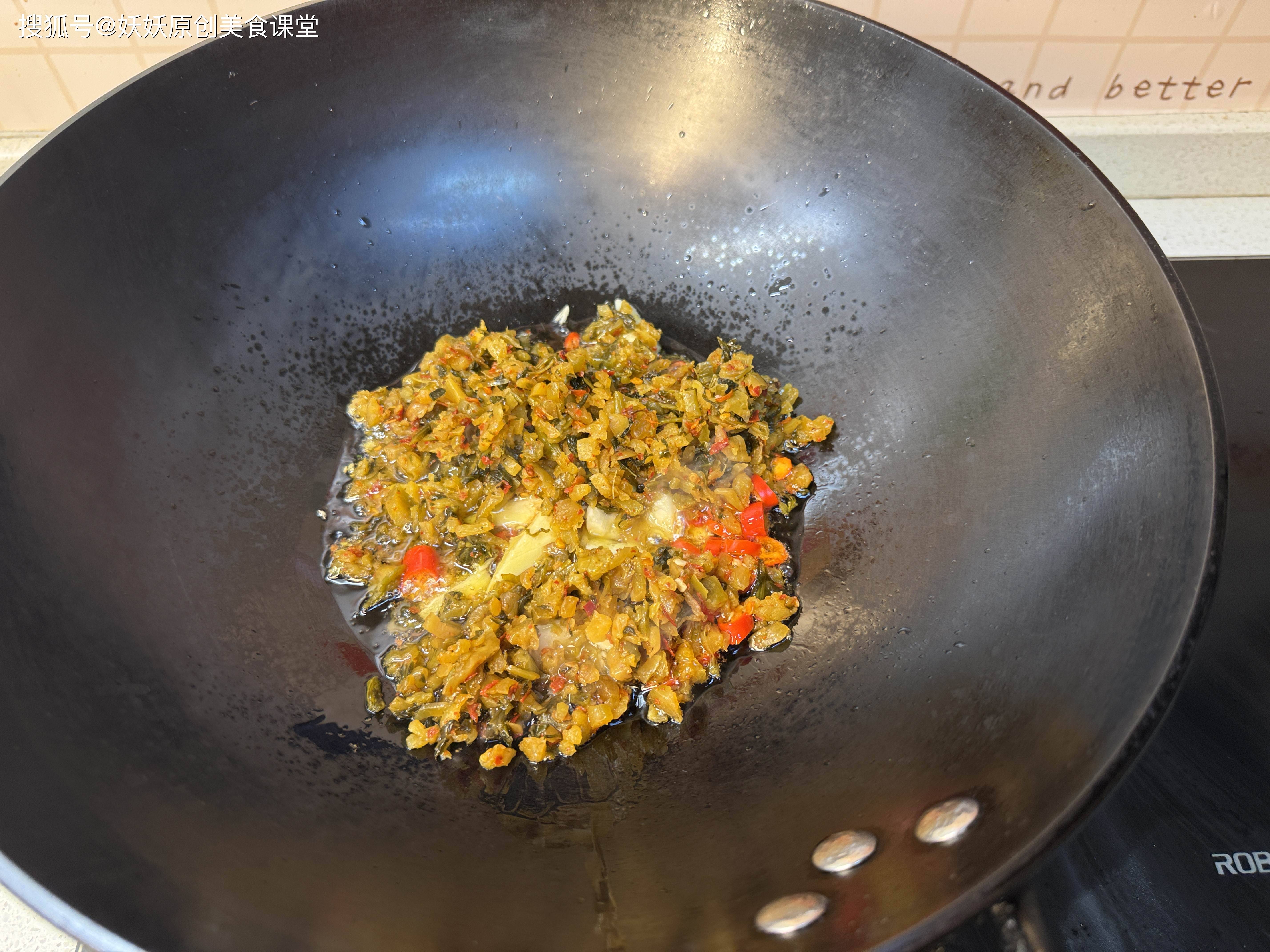 2,下入酸菜翻炒,酸菜如果太咸可以提前清洗一下,再翻炒掉酸菜中的水气,这样烧猪血的时候不会有异味。