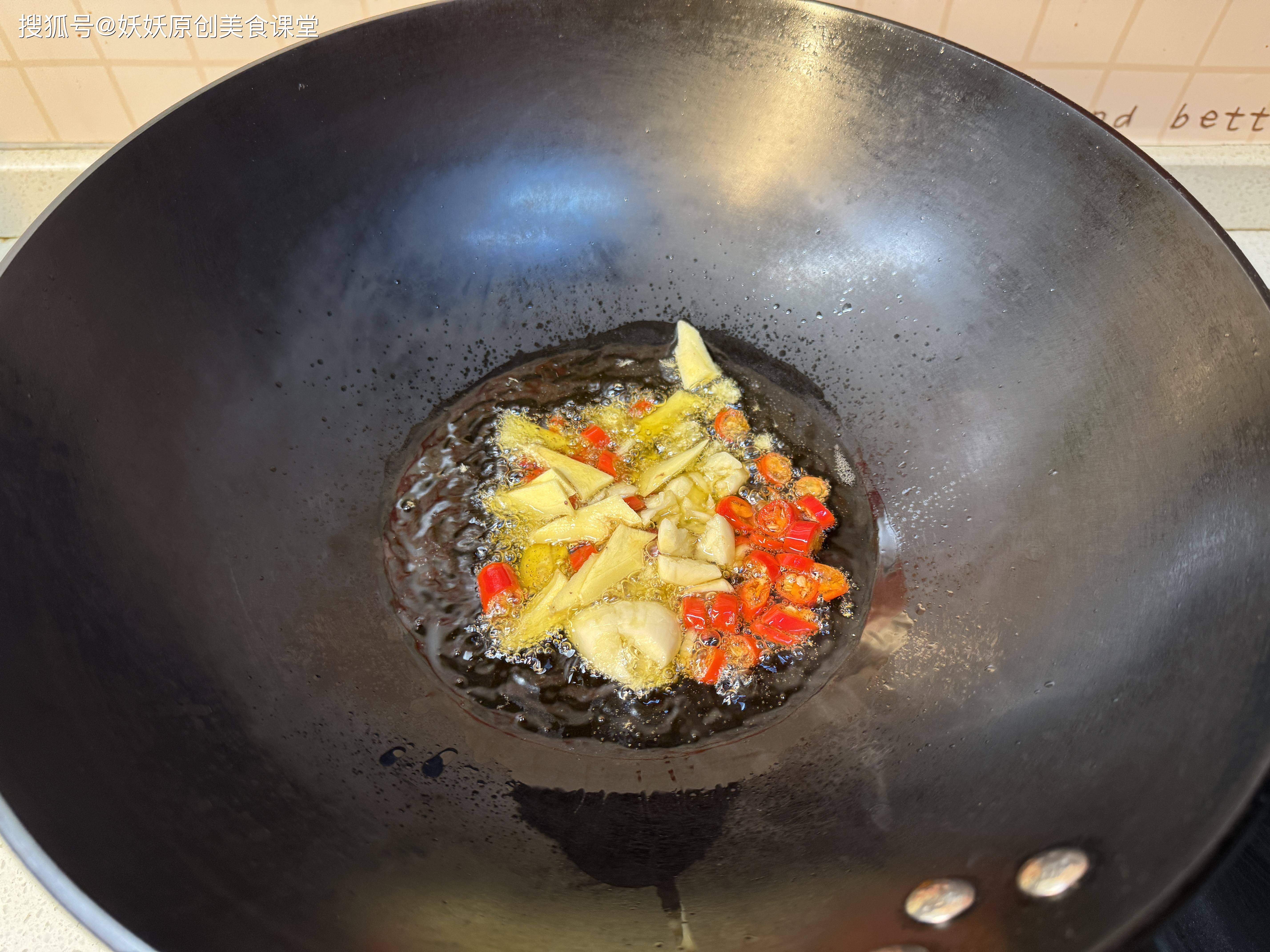 1,油锅烧热,下入姜蒜小米辣炒香,大蒜的用量可以多一点,大概5瓣左右,小米辣依个人口味酌情增减。