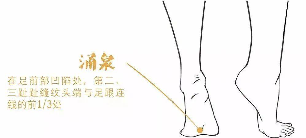 涌泉穴处在足底,当脚部弯曲、脚趾蜷缩时,足底最凹陷的部位便是该穴。
