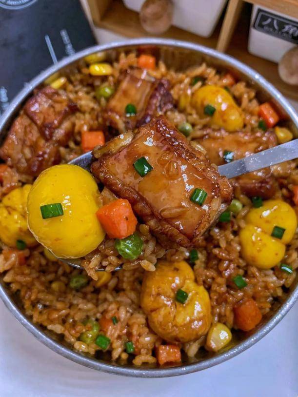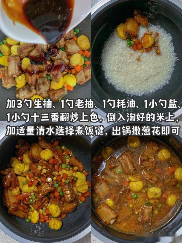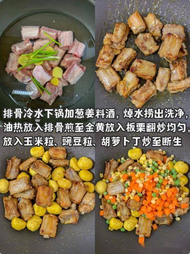 材料:适量排骨,葱姜料酒,玉米粒,适量板栗,适量时蔬粒,老抽,生抽,蚝油,盐,葱花。