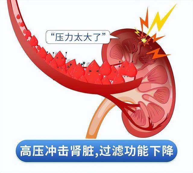 肾脏里全是密密麻麻的毛细血管,就像筛子一样过滤血液里的废物。血压高了,这些 “小筛子” 就会被高压冲得变形、破损,时间长了筛子漏了,蛋白质漏到尿里,废物堵在肾里,肾功能就垮了。