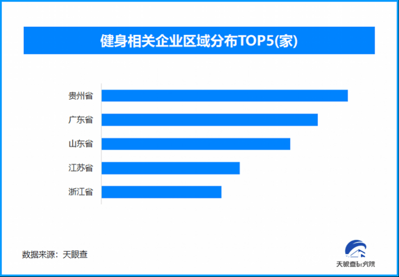 天眼查专业版数据显示,截至目前我国现存在业、存续状态的健身相关企业超163.6万家。从区域分布来看,贵州省、广东省、山东省、江苏省健身相关企业数量位居前列,四个省市数量总和超过59万家,占企业总数的36.07%。