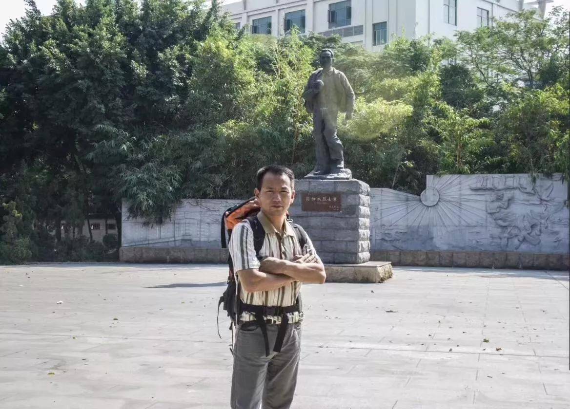 图8:那一年,刘英智为了追踪彭加木的相关信息,特意来到广州番禺,这里有彭加木的塑像。