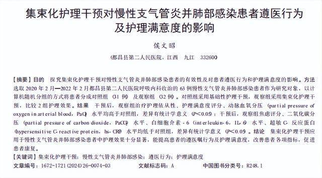 侯文昭.集束化护理干预对慢性支气管炎并肺部感染患者遵医行为及护理满意度的影响,基层医学论坛,2024-09-10