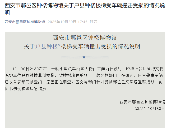 不久后,西安市鄠邑区钟楼博物馆发布说明,目前肇事车辆已被公安部门查扣,原因正在调查。区文物部门针对受损部位已采取设置警戒线、封闭北侧楼梯等应急措施。