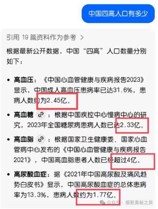 四高人群的需求与选择就是巨大的财富机遇,我国四高的基数庞大,豆包显示我国四高数据如下:
