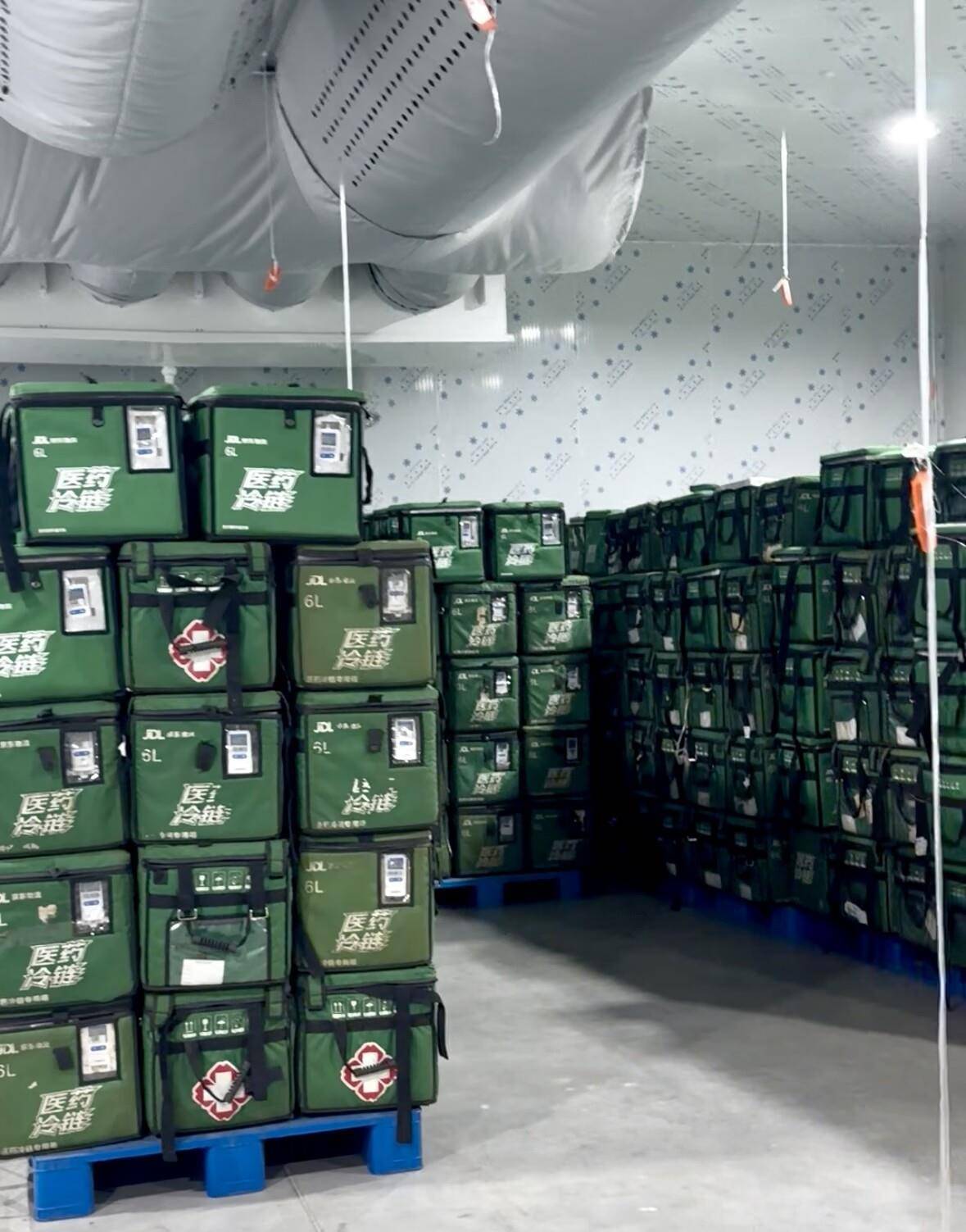 仓经理王旋指着堆放在一旁的保温箱介绍:“为了精准锁温,我们用的是医药专用智能保温箱,内置专业相变材料与真空隔热结构,经过严格的预冷、释冷流程后,能快速将箱内温度稳定在 2-8℃,恒温时效长达 72 小时。”他还提到,箱子里配备了远程高精度温度计,温度数据实时上传,“全程监控,一点不马虎,确保每一份药品安全高效运输。”