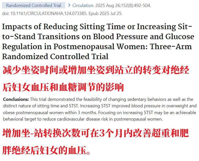 研究纳入407人,少坐组136人,增加坐-站切换次数组136人,对照组135人。经过3个月干预,结果显示,增加坐-站切换次数组的舒张压减少了2.24 mmHg,收缩压降低了3.33 mmHg。