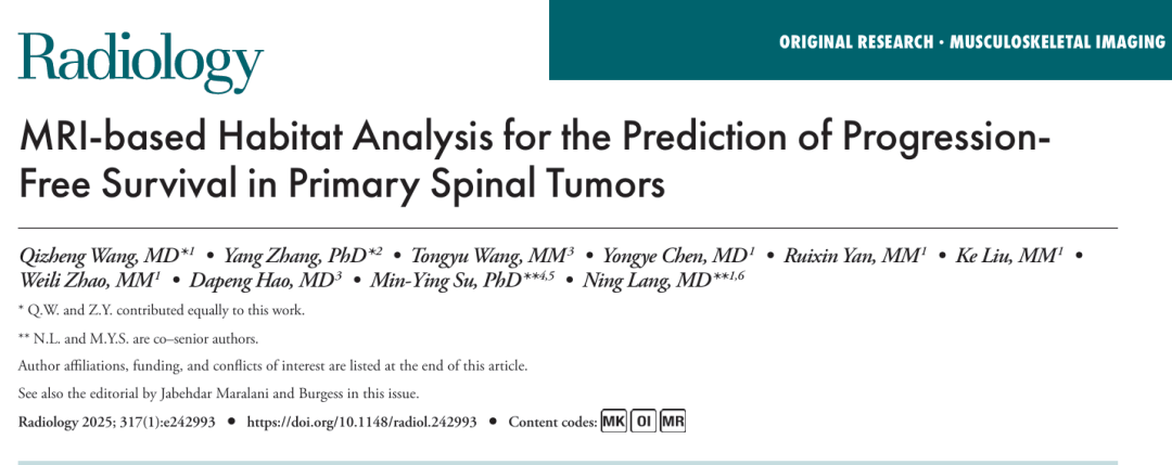 10月31日“北京大学第三医院”公众号发文,2025年10月28日,北医三院放射科郎宁教授团队在国际权威期刊Radiology(IF 15.2)发表题为“MRI-based Habitat Analysis for the Prediction of Progression-Free Survival in Primary Spinal Tumors”(基于MRI嵌套生境影像分析的原发性脊柱肿瘤无进展生存期预测)的最新研究成果。