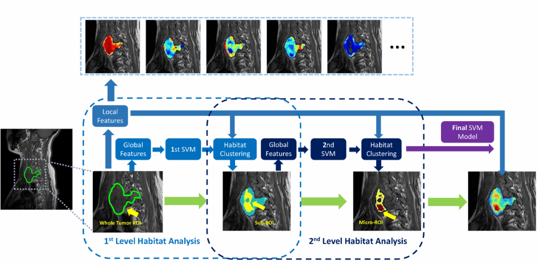 嵌套生境分析以病灶MRI特征为输入,经两层迭代依次提取“子区域”和“微区域”,实现肿瘤内部空间异质性的分层解析