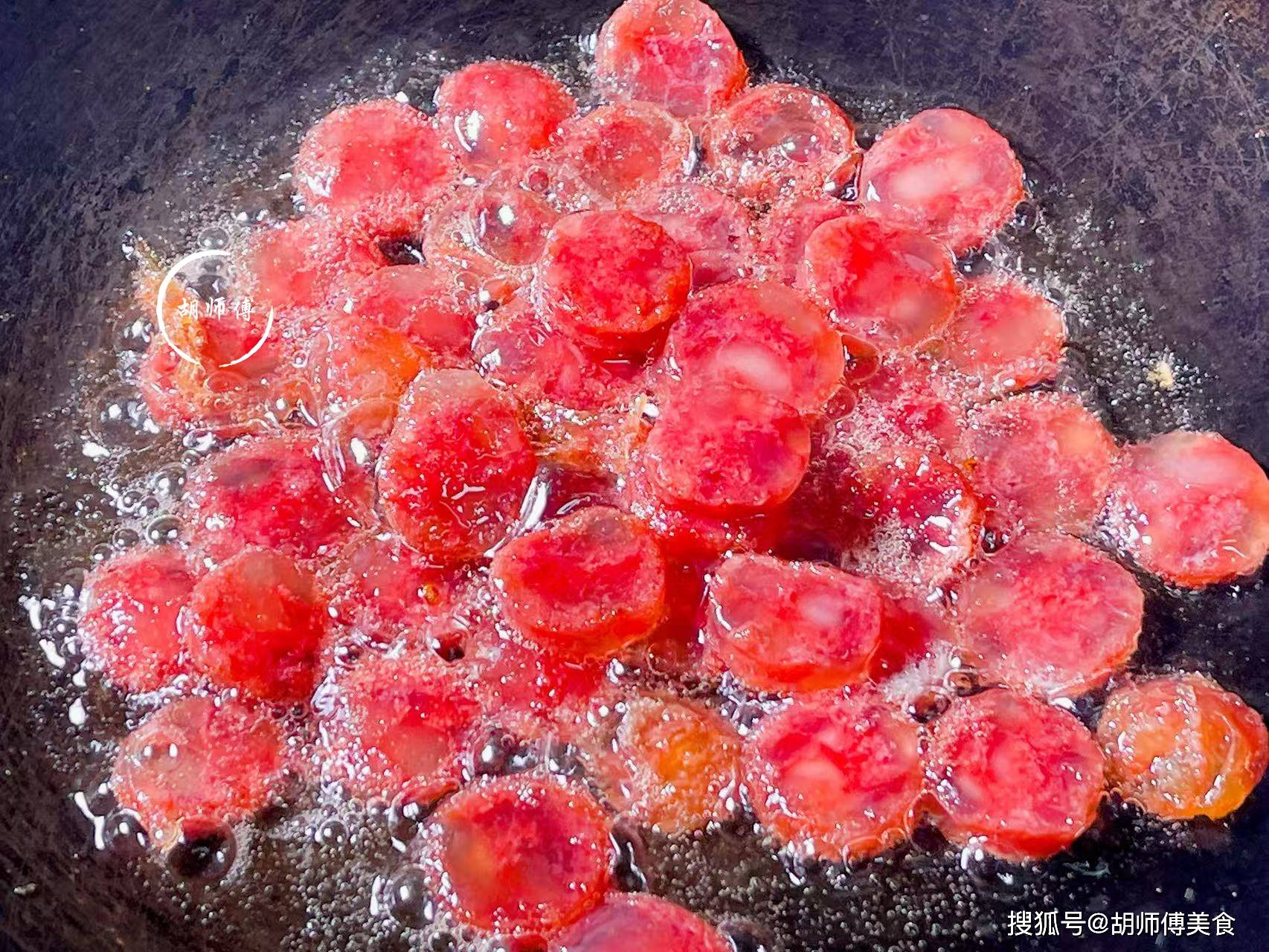 第三步:锅中留少许底油,再把甜肠放入锅中,中小火将甜肠炒的发卷即可起锅备用。