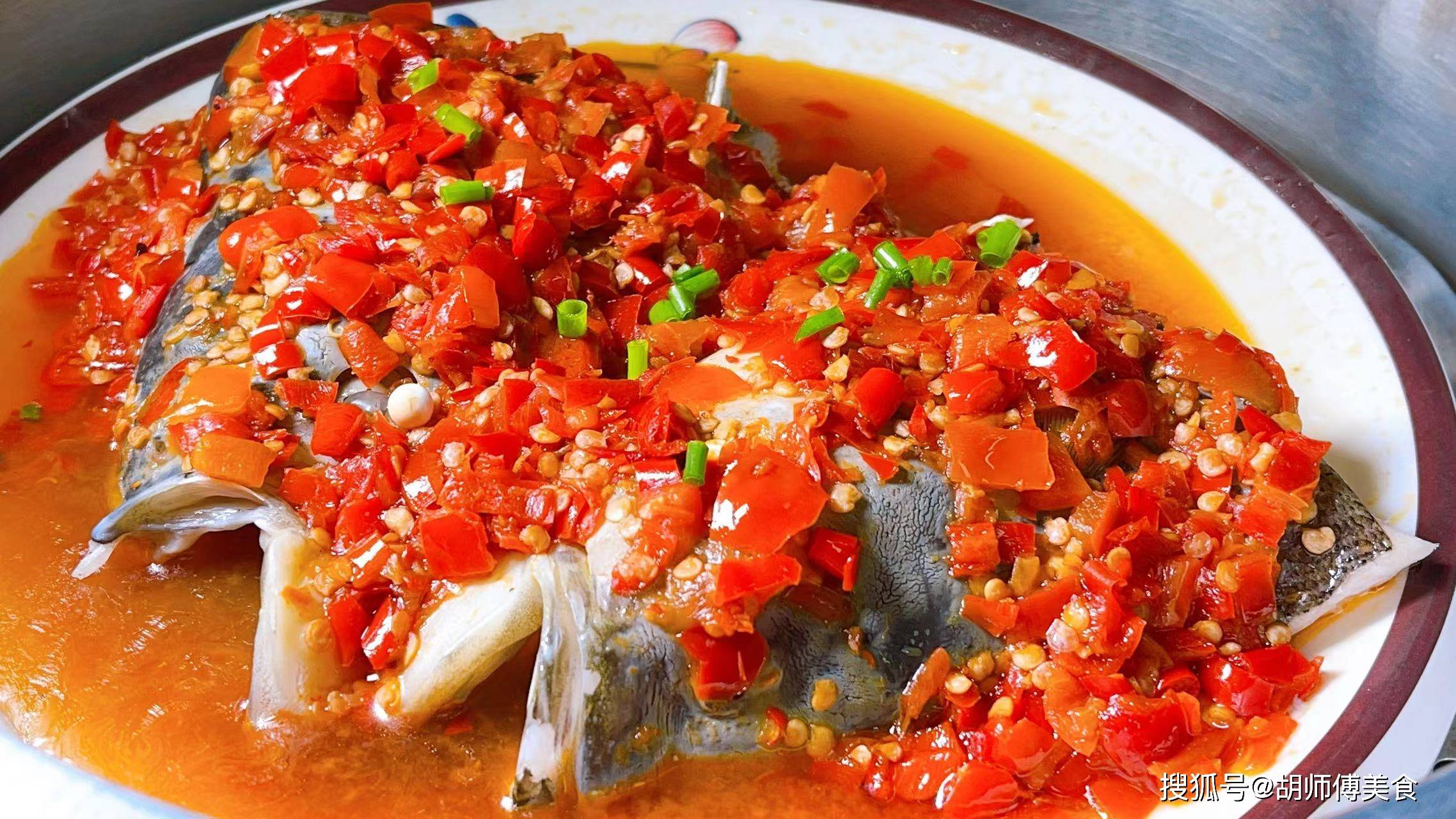 第二步:将胖头鱼头摆到盘中,然后将剁椒和蒸鱼豉油淋到胖头鱼头上,接着把胖头鱼头放入蒸锅中,大火蒸20分钟即可关火,最后淋上一勺滚沸的热油到剁椒上即可食用。