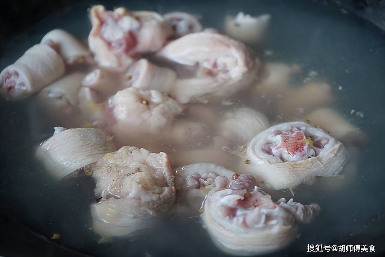 第一步:首先将猪尾巴烧一下,烧掉表面毛后,用钢丝球将烧黑的部位刷洗干净,接着再把猪尾巴剁成小段,最后将猪尾巴和适量水、白酒放入锅中,大火将猪尾巴焯水10分钟后捞出,冲洗干净备用。