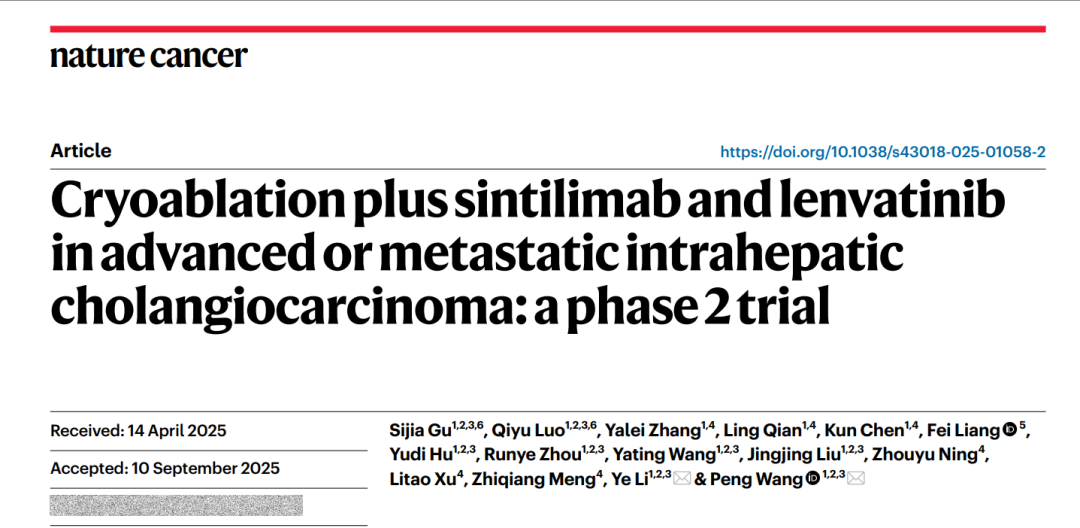 此背景下,11月2日,复旦大学附属中山医院王鹏教授团队在《自然·癌症》(Nature Cancer)在线发表了题为“冷冻消融联合信迪利单抗和仑伐替尼治疗晚期/转移性肝内胆管癌”的Ⅱ期临床研究结果。该方案针对一线治疗失败的晚期肝内胆管癌患者,将客观有效率(ORR)从既往约5%显著提升至75%,中位无进展生存(PFS)期从2-4个月提升到16.8个月,总生存(OS)期达25.4个月,且安全性良好。这一成果不仅是我国肝胆肿瘤领域原创性突破的重要体现,更为全球晚期胆管癌治疗提供了新思路。