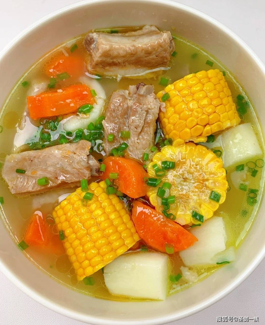 材料:排骨 500 克、胡萝卜 1 根、玉米 1 根、姜片、葱段、料酒、盐