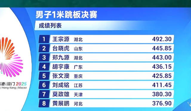 2025年全国运动会跳水男子1米板比赛于11月4日晚18点在北京时间准时举行。湖北选手王宗源在比赛中表现非常稳定,整场比赛节奏控制得当,最终凭借492.30分的高分赢得金牌。山东的台晓虎获得银牌,来自湖北的郑九源则以较小的差距获得铜牌。