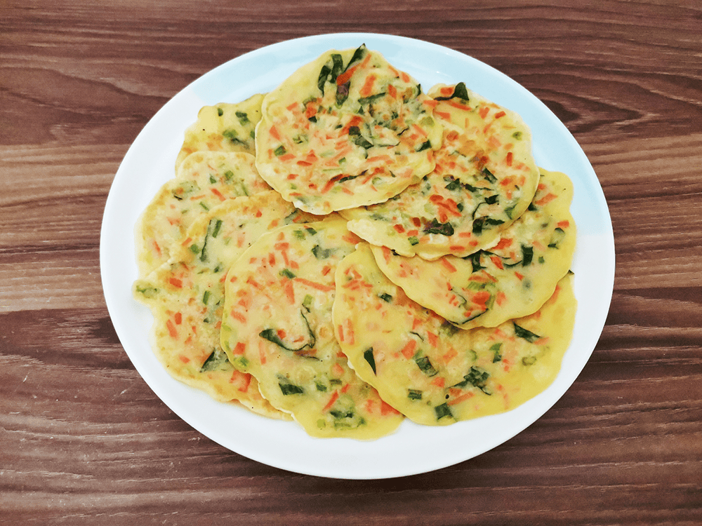 2、放到碗里,另外切点胡萝卜碎,鸡蛋放一个,先扒拉散,再补充50克白开水,继续加面大约100克,调成老酸奶一样的粘稠度,别忘了加一点盐,有点咸味更好吃。