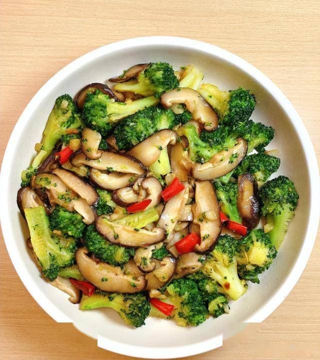 6. 加入香菇片翻炒至变软,再放入焯好水的西兰花继续翻炒。