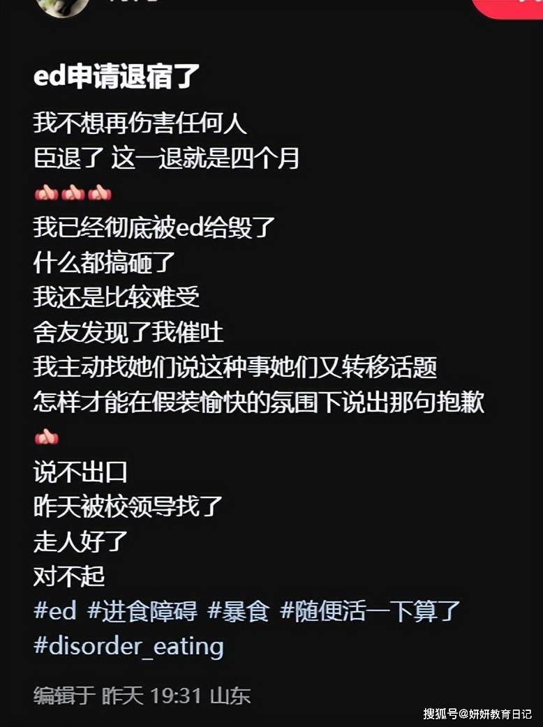 那么在这个宿舍里谁会经常吐呢?肯定就是那位吃了东西又非要原路退货的ED妹妹了。因为现在网上,确实有很多中学生和大学生喜欢称自己有这种障碍。