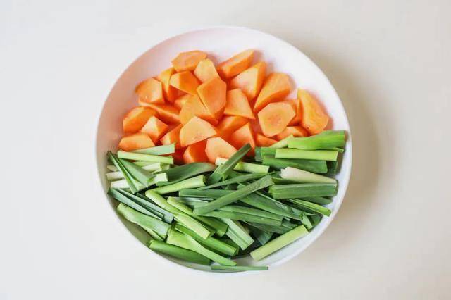 3.胡萝卜洗净削皮,切成滚刀块;蒜苗洗净切段备用;