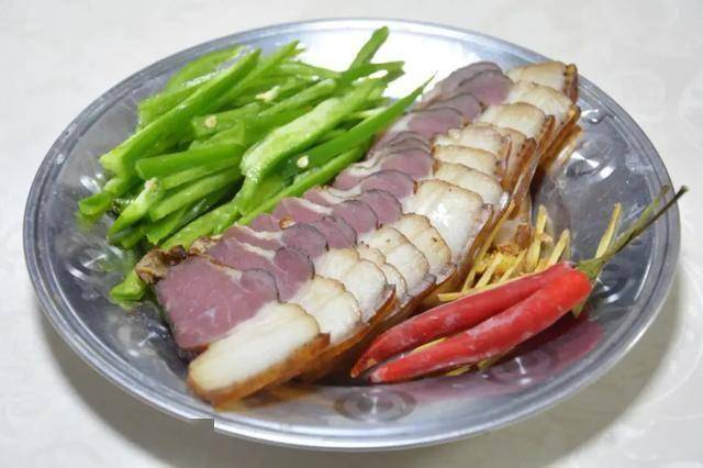4.腊肉是湖南腊肉,很赞。腊肉先水煮20分钟,捞出放凉备用,切点青红椒丝,姜丝备用;