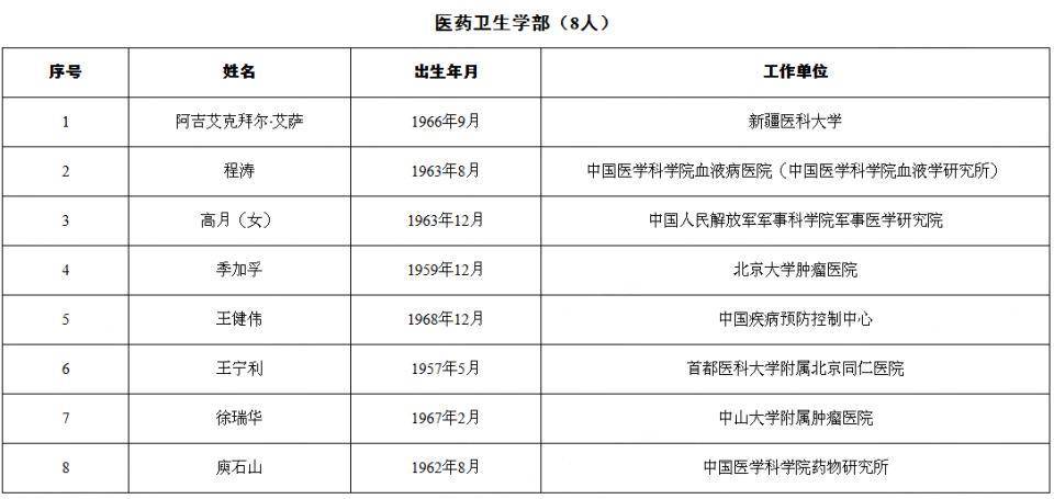 以下为中国科学院生命科学和医学学部、中国工程院医药卫生学部2025年院士增选当选院士名单: