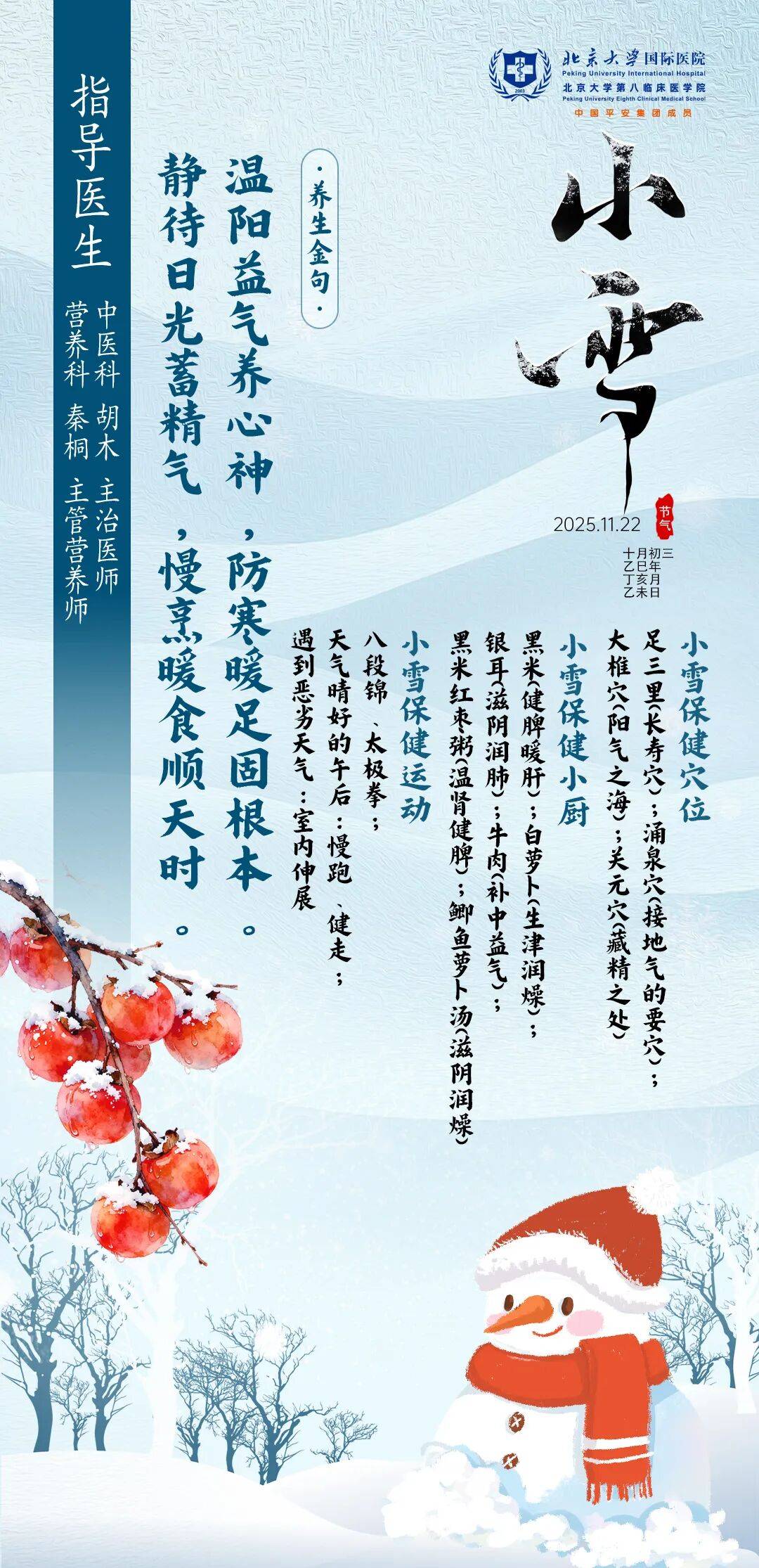 小雪节气已至,天气渐寒,人们应该顺应自然,保护好我们的阳气,做好“冬藏精”的准备。这一时节,养生重在“御寒保暖、滋阴潜阳”,饮食上应遵循“温润滋补、增苦少咸”的原则,为身体积蓄能量,安然过冬。