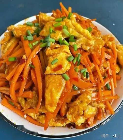 7. 撒入葱绿,淋芝麻香油,借余温翻匀,装盘后立即盖盖焖30秒,让香气回渗,成品色泽金黄橘红,蛋嫩蔬脆。