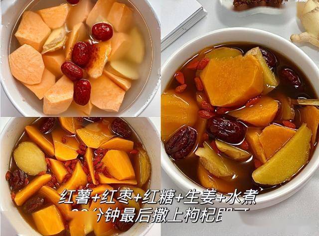 材料:一根红薯,一把枸杞,适量红糖,一块生姜,适量红枣,