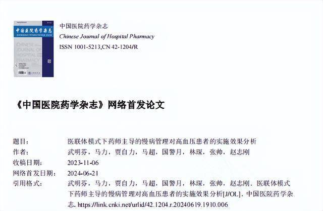 武明芬.医联体模式下药师主导的慢病管理对高血压患者的实施效果分析,中国医院药学杂志,2024-06-21