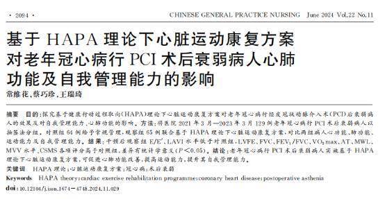 [1]常维花.基于HAPA理论下心脏运动康复方案对老年冠心病行PCI术后衰弱病人心肺功能及自我管理能力的影响,全科护理,2024-06-15