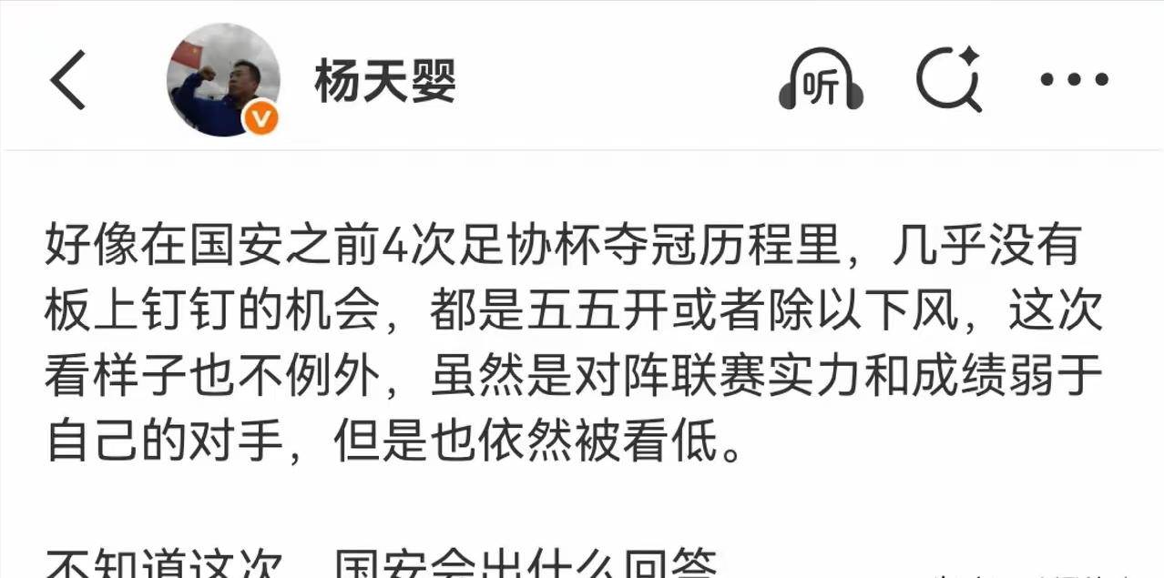 对于本周六的足协杯决赛,杨天婴预测,北京国安在外界普遍不看好的情况下,应该能够大比分战胜河南队,最终夺得冠军。这场比赛不仅将为北京国安赢得明年征战亚洲顶级联赛的资格,还能为本赛季画上一个完美的句号。至于具体的比分预测,杨天婴认为北京国安将以4-1的比分战胜河南队。