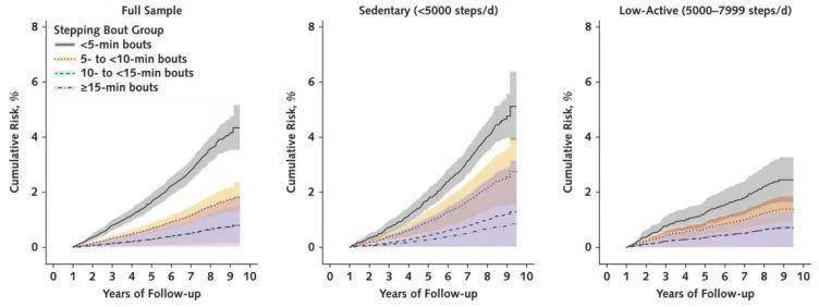 对于活动少的人群(日均步数 5000~7999 步)且单次行走不足5分钟的人群,9.5 年累积死亡率达2.46%,心血管疾病累积发病率为9.33%,而同样活动少但能以15分钟及以上连续方式积累步数的人群,两项指标分别降至0.72%和3.57%。