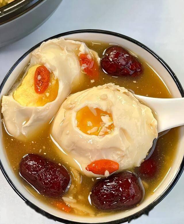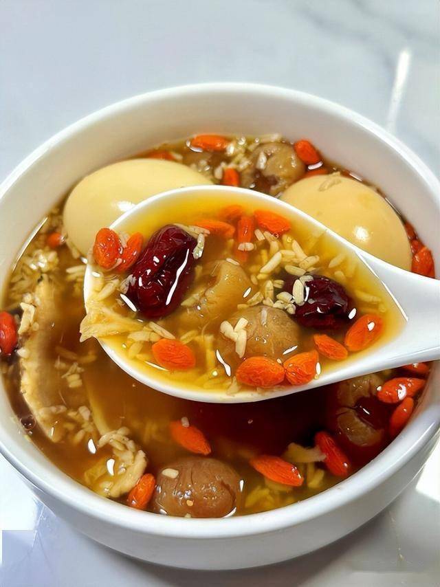 7. 盛出装碗,趁热饮用(酒酿当归活血暖宫,当归补血调经,酒酿润肤,适合更年期女性缓解手脚冰凉)。