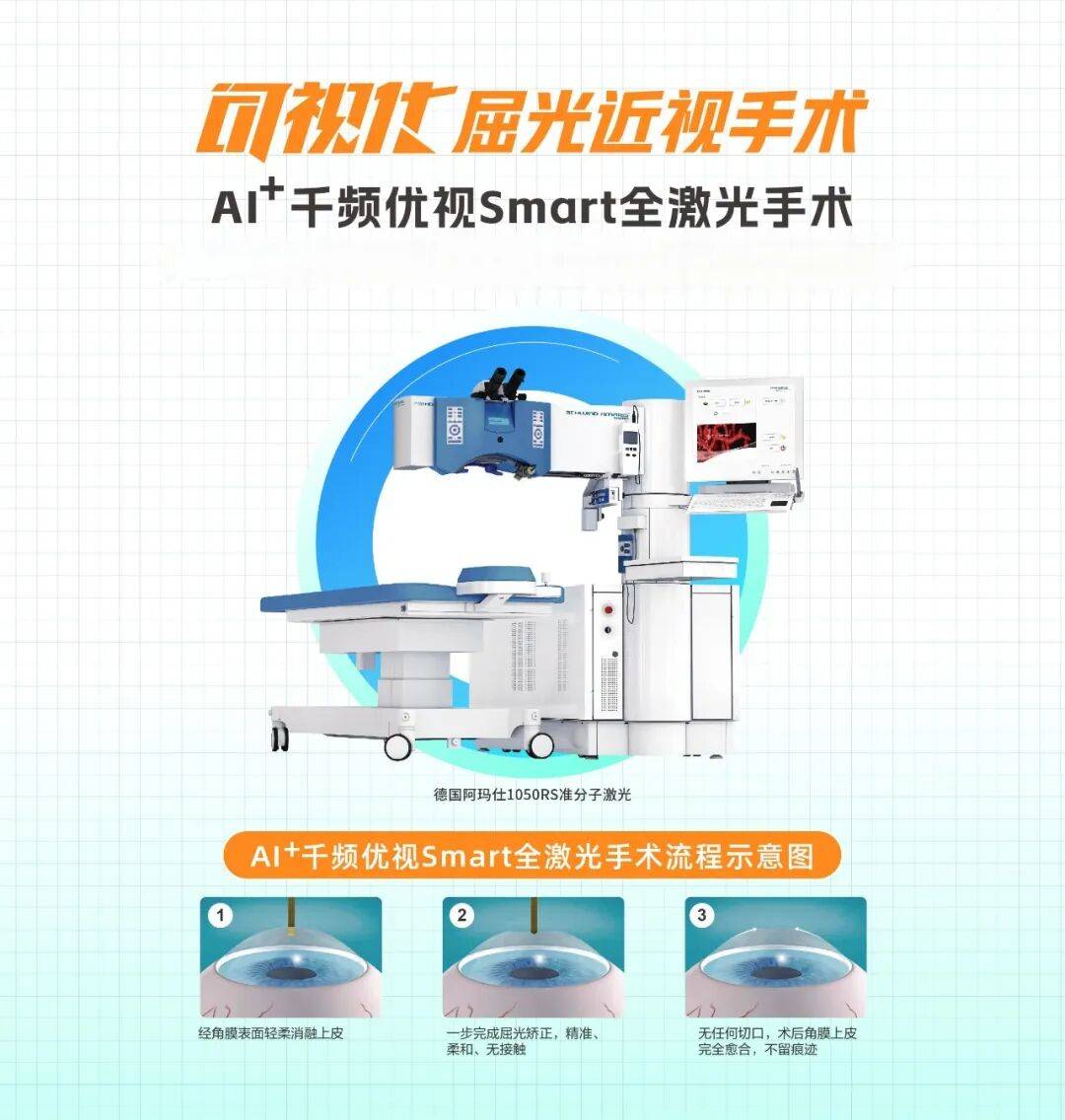 全激光手术则是利用激光直接切削角膜,适合中低度近视(近视度数小于600度、散光小于400度)、角膜偏薄的人群。
