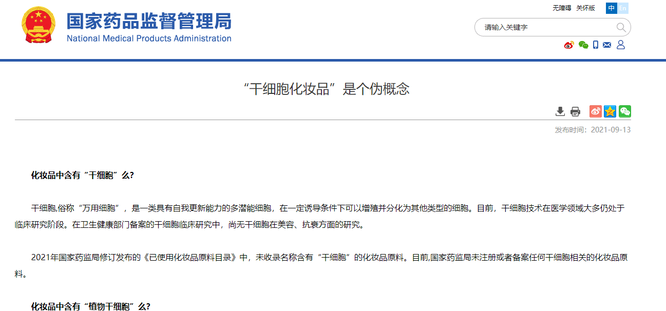 2021年国家药监局修订发布的《已使用化妆品原料目录》中,未收录名称含有“干细胞”的化妆品原料。目前,国家药监局未注册或者备案任何干细胞相关的化妆品原料。