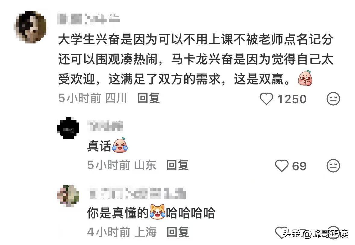 一些现场的大学生还开玩笑地称,现场有人将马克龙称作马卡龙,许多学生其实并不认识他,只是凑热闹。而马克龙则似乎沉浸在这种热烈氛围中,不自觉地满足了自己想像明星一样受欢迎的愿望。