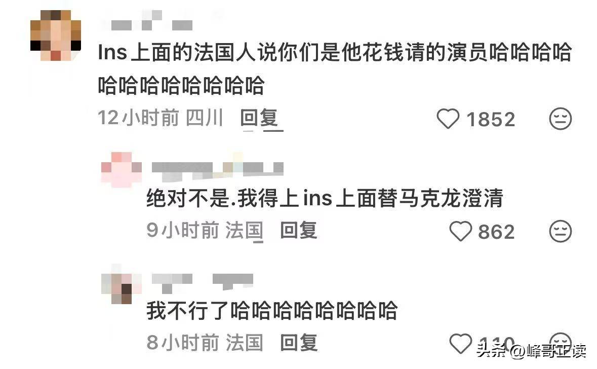 然而,法国网友对此却感到有些困惑。在法国,马克龙的受欢迎程度远不如在中国。因为他上任后实施了一系列改革措施,如延迟退休年龄等,这引发了大量民众的不满,甚至被一些人视为不受欢迎的总统。因此,看到马克龙在中国如此受欢迎,许多法国网友开始怀疑这些学生是不是马克龙特意雇来的演员。