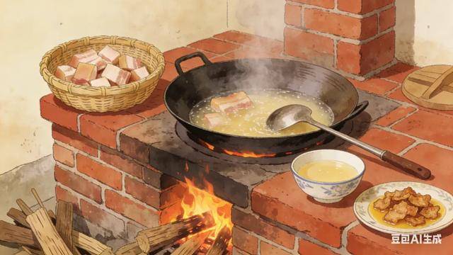 在寻常百姓的厨房里,猪油是化平凡为神奇的魔法。熬猪油,是几代人共同的味觉记忆。肥膘切块,入锅慢熬,随着清水蒸干,清澈油脂淅沥而出,满屋异香。剩下的油渣,撒点盐便是馋人的零嘴,或用来炒青菜,让素菜饱吸荤香。