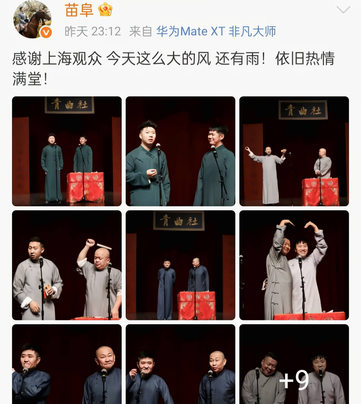 以上海的商演为例,郭德纲和搭档于谦在上海举办的专场,可以说是人满为患,场面火爆到极点。郭德纲还特别发文,配上了观众热烈反应的现场照片,感谢大家的支持和热情。而相较之下,苗阜的青曲社同样在上海举办了专场,并且也发文感谢观众,但内容的呈现方式却有些不同。