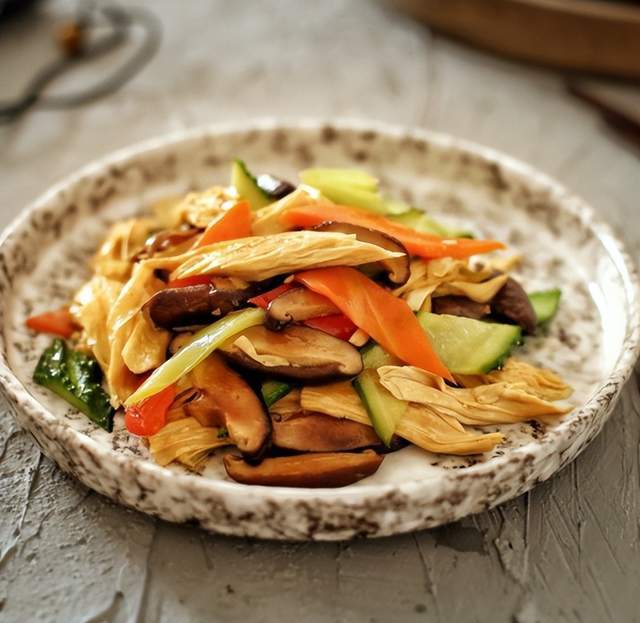 1. 干腐竹提前用清水浸泡3小时(夏季需放冰箱冷藏浸泡,避免变质),泡软后切成5厘米长的段;干香菇和干木耳提前用清水浸泡1小时,泡软后洗净,香菇去蒂切片,木耳撕成小朵;胡萝卜去皮,切成薄片;青椒洗净,去籽后切成丝;大蒜去皮,切成蒜末备用。