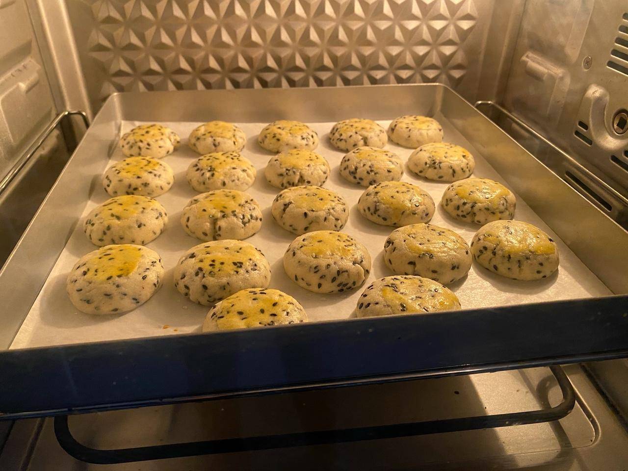 4、在烤盘中垫上吸油纸,将其分成小份,简单搓圆压扁就可以,摆放到吸油纸上,表面刷上蛋黄液、