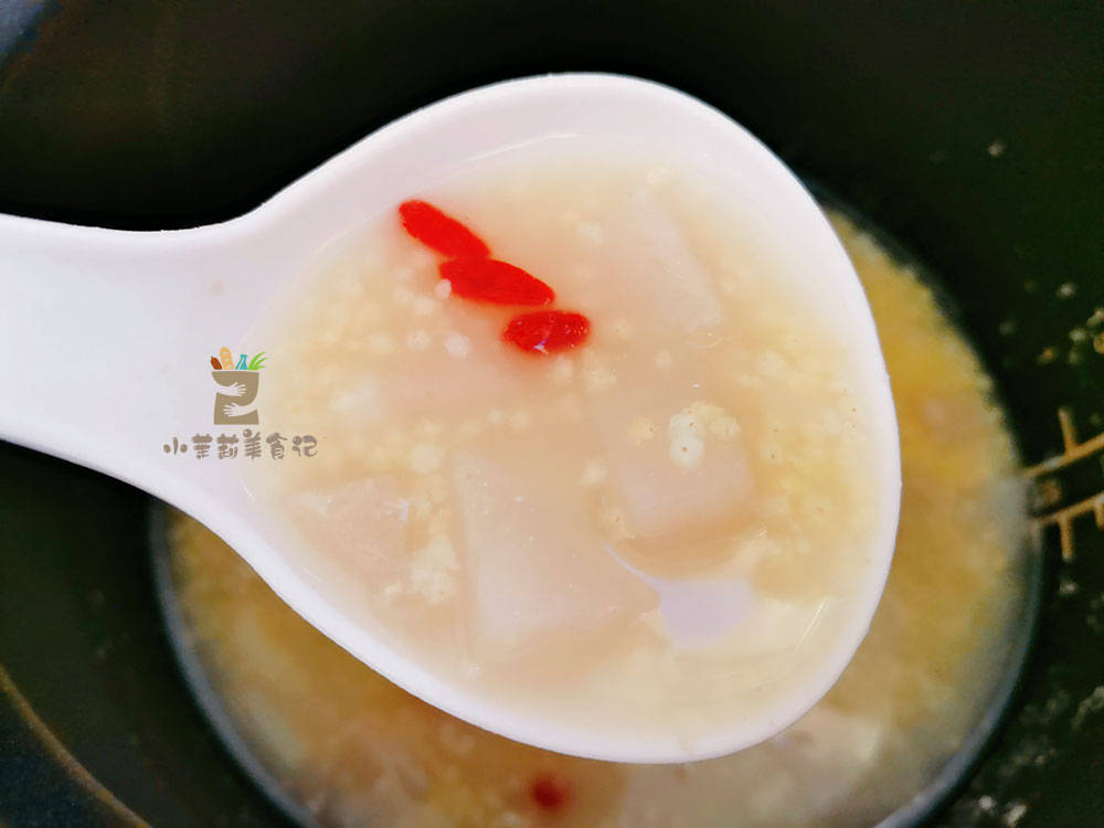 3、梨与枸杞都倒在锅里,与小米一起煮,四十分钟左右,软烂粘稠,再焖五分钟,即可享用。